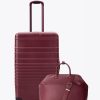 Sophistication in motion: The Essential Check-In Set—our Essential Weekender and 26 Check-In Roller. now bundled at 15% off. The Weekender. with pebbled vegan-leather texture and luxe gold hardware. opens wide for effortless packing while its organized interior keeps your laptop. water bottle. and essentials in perfect order. Slide it over your suitcase using the trolley pass-through or sling it crossbody with the detachable strap. Paired with the 26 Check-In Roller’s smooth-rolling wheels. expandable shell. and durable protective casing. this matched set is as functional as it is indulgent.